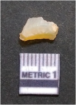 | Description / विवरण | It is chalcedony flake, translucent in appearance. The piece shows sharp pointed ends and flake scars on the surface as a result of flaking. The piece shows a bulb of percussion. |