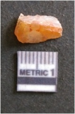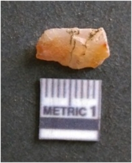 | Description / विवरण | It is chalcedony flake, translucent in appearance. The piece shows sharp pointed ends and flake scars on the surface as a result of flaking. The piece shows a bulb of percussion, and on the verse of turning to carnelian due to applied heat. |