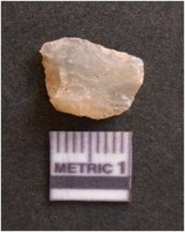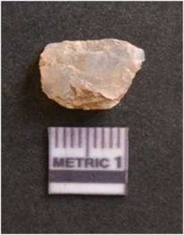 | Description / विवरण | The quartz flake has sharp flaked edges and pointed ends as a result of flaking. The piece is semi-transparent in nature with irregular fracture pattern. The piece is roughly triangular in shape and has a prominent bulb of percussion. |