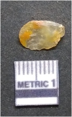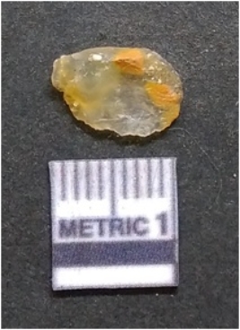 | Description / विवरण | It is chalcedony flake, translucent in appearance. The piece shows sharp pointed ends and flake scars on the surface as a result of flaking. The piece shows a bulb of percussion. |