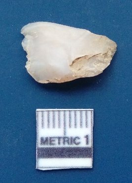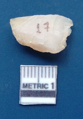 | Description / विवरण | The quartz flake has sharp flaked edges and pointed ends as a result of flaking. The piece is semi-transparent in nature with irregular fracture pattern. The piece is roughly triangular in shape and has a prominent bulb of percussion. |