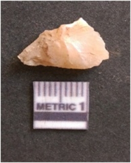 | Description / विवरण | The quartz flake has sharp flaked edges and pointed ends as a result of flaking. The piece is semi-transparent in nature with irregular fracture pattern. The piece is roughly triangular in shape and has a prominent bulb of percussion. |