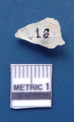 | Description / विवरण | The quartz flake has sharp flaked edges and pointed ends as a result of flaking. The piece is semi-transparent in nature with irregular fracture pattern. The piece is roughly triangular in shape and has a prominent bulb of percussion. |