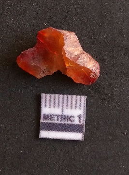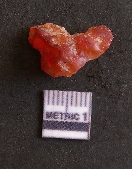 | Description / विवरण | The carnelian flake is reddish in color, with sharp flakes edges and a small bulb of percussion owing to knapping activity. |
