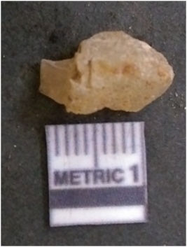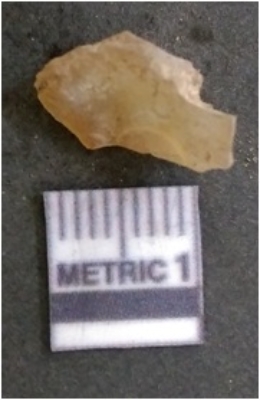 | Description / विवरण | It is chalcedony flake, translucent in appearance. The piece shows sharp pointed ends and flake scars on the surface as a result of flaking. The piece shows a bulb of percussion. |