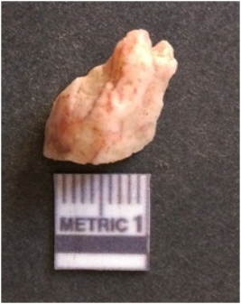 | Description / विवरण | The quartz flake has sharp flaked edges and pointed ends as a result of flaking. The piece is semi-transparent in nature with irregular fracture pattern. The piece is roughly triangular in shape and has a prominent bulb of percussion. |