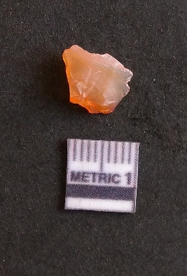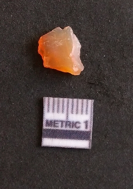 | Description / विवरण | The carnelian flake is reddish in color, with sharp flakes edges and a small bulb of percussion owing to knapping activity. |