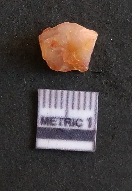 | Description / विवरण | The carnelian flake is reddish in color, with sharp flakes edges and a small bulb of percussion owing to knapping activity. |