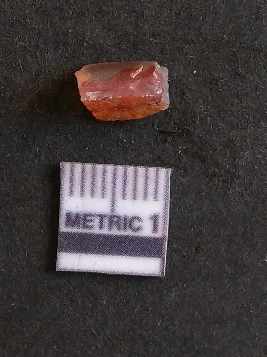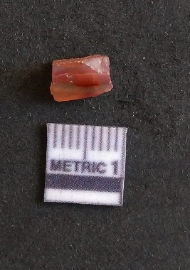| Description / विवरण | The carnelian flake is reddish in color, with sharp flakes edges and a small bulb of percussion owing to knapping activity. |