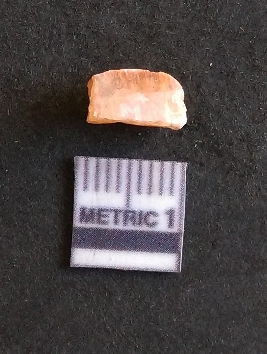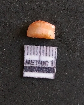 | Description / विवरण | The carnelian flake is reddish in color, with sharp flakes edges and a small bulb of percussion owing to knapping activity. |