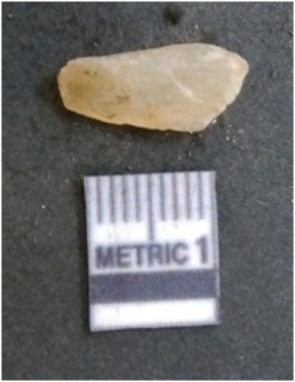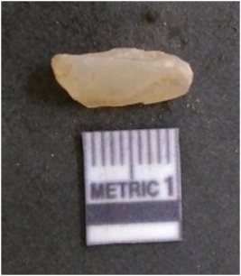 | Description / विवरण | It is chalcedony flake, translucent in appearance. The piece shows sharp pointed ends and flake scars on the surface as a result of flaking. The piece shows a bulb of percussion. |