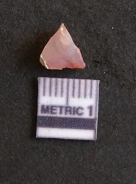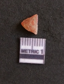 | Description / विवरण | The carnelian flake is reddish in color, with sharp flakes edges and a small bulb of percussion owing to knapping activity. |