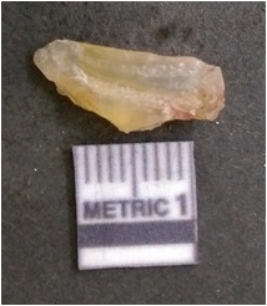 | Description / विवरण | It is chalcedony flake, translucent in appearance. The piece shows sharp pointed ends and flake scars on the surface as a result of flaking. The piece shows a bulb of percussion. |