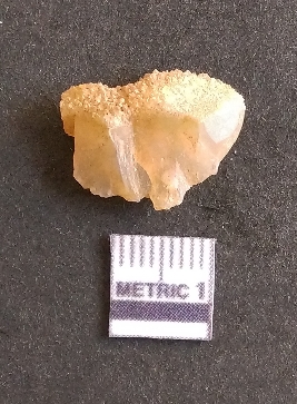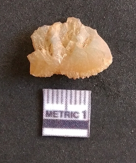 | Description / विवरण | The carnelian flake is reddish in color, with sharp flakes edges and a small bulb of percussion owing to knapping activity. |