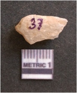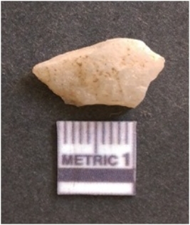 | Description / विवरण | The quartz flake has sharp flaked edges and pointed ends as a result of flaking. The piece is semi-transparent in nature with irregular fracture pattern. The piece is roughly triangular in shape and has a prominent bulb of percussion. |