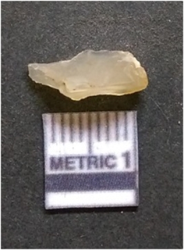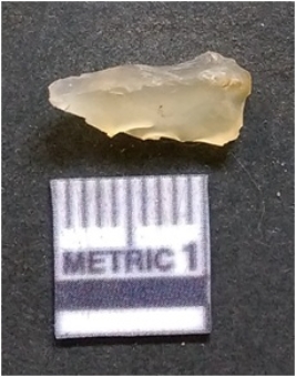 | Description / विवरण | It is chalcedony flake, translucent in appearance. The piece shows sharp pointed ends and flake scars on the surface as a result of flaking. The piece shows a bulb of percussion. |