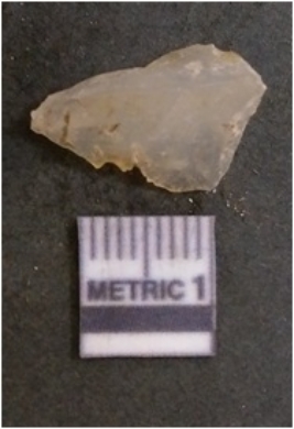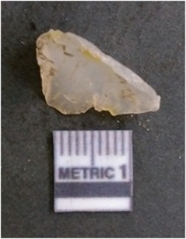 | Description / विवरण | It is chalcedony flake, translucent in appearance. The piece shows sharp pointed ends and flake scars on the surface as a result of flaking. The piece shows a bulb of percussion. |