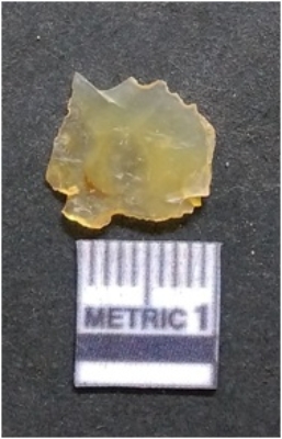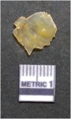 | Description / विवरण | It is chalcedony flake, translucent in appearance. The piece shows sharp pointed ends and flake scars on the surface as a result of flaking. The piece shows a bulb of percussion. |