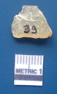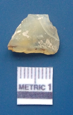 | Description / विवरण | It is chalcedony flake, translucent in appearance. The piece shows sharp pointed ends and flake scars on the surface as a result of flaking. The piece shows a bulb of percussion. |
