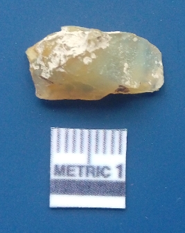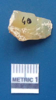 | Description / विवरण | It is chalcedony flake, translucent in appearance. The piece shows sharp pointed ends and flake scars on the surface as a result of flaking. The piece shows a bulb of percussion. |