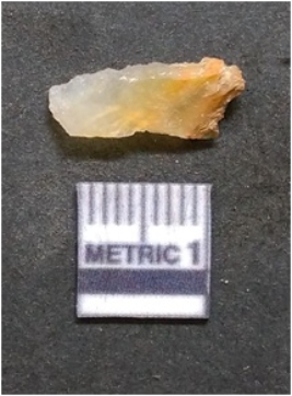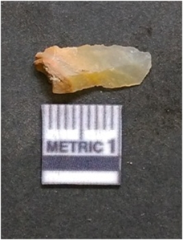 | Description / विवरण | It is chalcedony flake, translucent in appearance. The piece shows sharp pointed ends and flake scars on the surface as a result of flaking. The piece shows a bulb of percussion. |