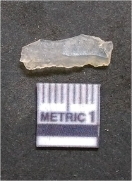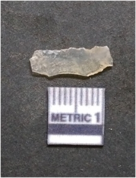| Description / विवरण | It is chalcedony flake, translucent in appearance. The piece shows sharp pointed ends and flake scars on the surface as a result of flaking. The piece shows a bulb of percussion. |
