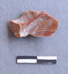 | Description / विवरण | It is a chert fragment, with a striking platform, cortex on one end; there are many flake scars with ripples on it. |