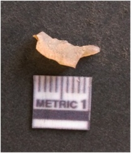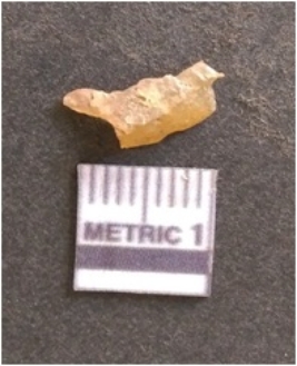 | Description / विवरण | It is chalcedony flake, translucent in appearance. The piece shows sharp pointed ends and flake scars on the surface as a result of flaking. The piece shows a bulb of percussion. |