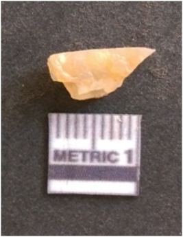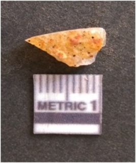 | Description / विवरण | It is chalcedony flake, translucent in appearance. The piece shows sharp pointed ends and flake scars on the surface as a result of flaking. The piece shows a bulb of percussion. |