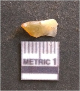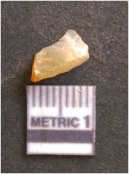| Description / विवरण | It is chalcedony flake, translucent in appearance. The piece shows sharp pointed ends and flake scars on the surface as a result of flaking. The piece shows a bulb of percussion. |