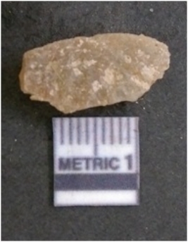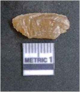 | Description / विवरण | It is chalcedony flake, translucent in appearance. The piece shows sharp pointed ends and flake scars on the surface as a result of flaking. The piece shows a bulb of percussion. |