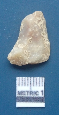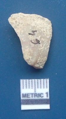 | Description / विवरण | The chert piece is dark in color, with a prominent bulb of percussion and sharp flaked edges. The piece is a part of lithic debitage or raw material for lithic knapping. The piece shows clear ripple marks and bulb of percussion. |