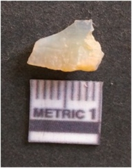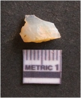 | Description / विवरण | It is chalcedony flake, translucent in appearance. The piece shows sharp pointed ends and flake scars on the surface as a result of flaking. The piece shows a bulb of percussion. |