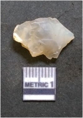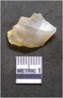 | Description / विवरण | It is chalcedony flake, translucent in appearance. The piece shows sharp pointed ends and flake scars on the surface as a result of flaking. The piece shows a bulb of percussion. |