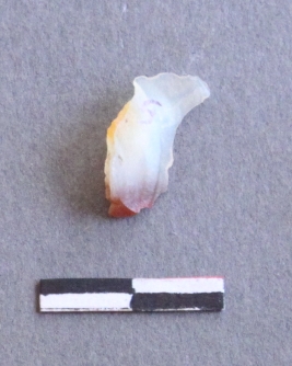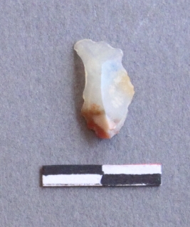 | Description / विवरण | It is a quartz piece with sharp edges and striking platform on the proximal end. Flakes scars on the surface with ripples on it. It has ferric impurities. |