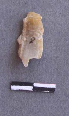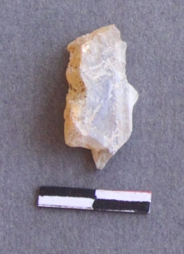 | Description / विवरण | It is a chalcedony fragment, with a striking platform, cortex on one end; there are many flake scars with ripples on it. |