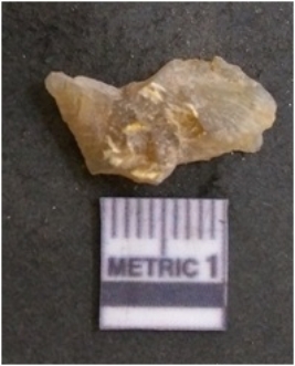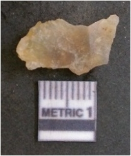 | Description / विवरण | It is chalcedony flake, translucent in appearance. The piece shows sharp pointed ends and flake scars on the surface as a result of flaking. The piece shows a bulb of percussion. |