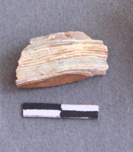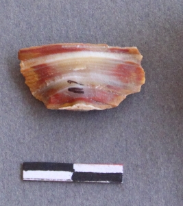 | Description / विवरण | It is a banded agate fragment, with bulb of percussion on ventral side of the fragment. Flake ridges on the surface. It is a banded agate and translucent in appearance. |