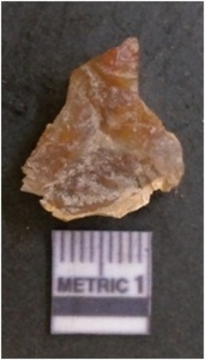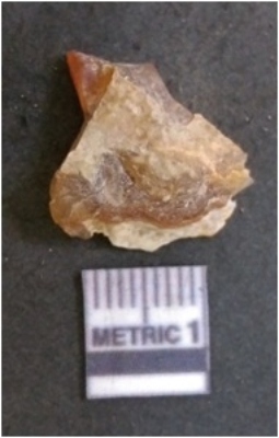 | Description / विवरण | It is chalcedony flake, translucent in appearance. The piece shows sharp pointed ends and flake scars on the surface as a result of flaking. The piece shows a bulb of percussion. |
