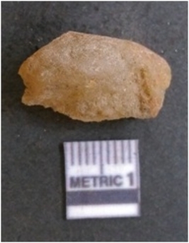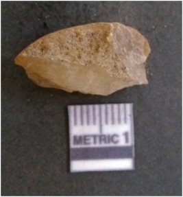 | Description / विवरण | It is chalcedony flake, translucent in appearance. The piece shows sharp pointed ends and flake scars on the surface as a result of flaking. The piece shows a bulb of percussion. |