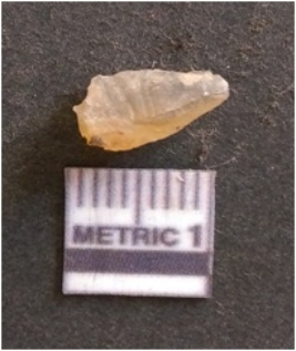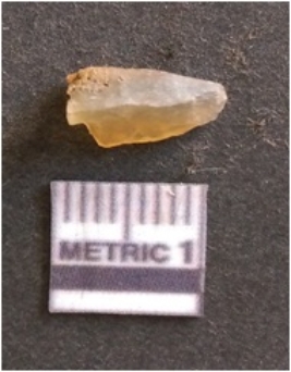| Description / विवरण | It is chalcedony flake, translucent in appearance. The piece shows sharp pointed ends and flake scars on the surface as a result of flaking. The piece shows a bulb of percussion. |