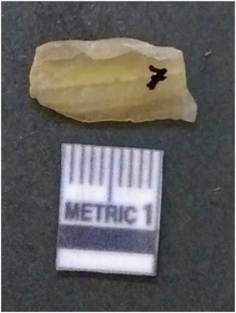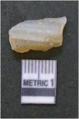 | Description / विवरण | The banded agate piece is crystalline in nature, with a smooth fracture pattern and visible bands on the flaked sides. The piece is pale in color and has sharp flaked ends. |