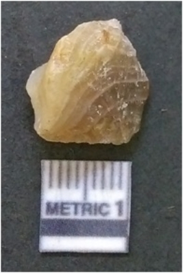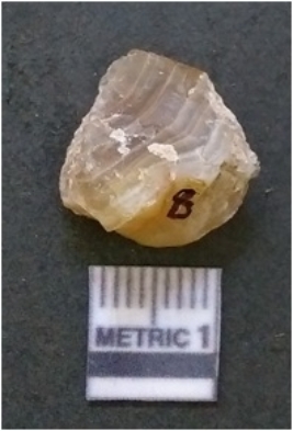 | Description / विवरण | The banded agate piece is crystalline in nature, with a smooth fracture pattern and visible bands on the flaked sides. The piece is pale in color and has sharp flaked ends. |