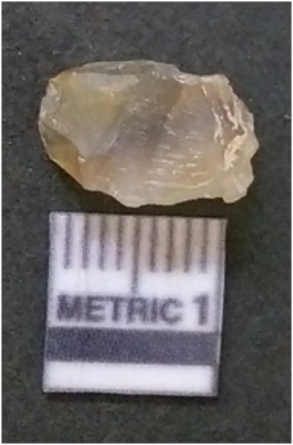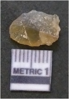 | Description / विवरण | The flake has irregular fracture pattern and sharp flaked edges as a result of lithic knapping activity. The piece is pale, with surfacial flake scars and a bulbous end. The flake is of smoky quartz variety, grayish in colour and translucent in appearance. |
