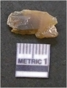 | Description / विवरण | The flake has irregular fracture pattern and sharp flaked edges as a result of lithic knapping activity. The piece is pale, with surfacial flake scars and a bulbous end. The flake is of smoky quartz variety, grayish in colour and translucent in appearance. |