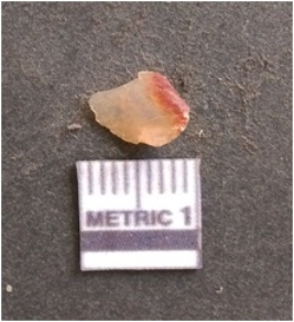 | Description / विवरण | It is chalcedony flake, translucent in appearance. The piece shows sharp pointed ends and flake scars on the surface as a result of flaking. The piece shows a bulb of percussion. |