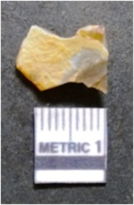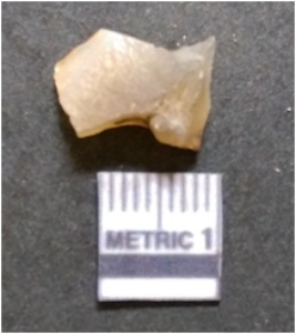| Description / विवरण | The flake has irregular fracture pattern and sharp flaked edges as a result of lithic knapping activity. The piece is pale, with surfacial flake scars and a bulbous end. The flake is of smoky quartz variety, grayish in colour and translucent in appearance. |