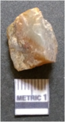 | Description / विवरण | The flake has irregular fracture pattern and sharp flaked edges as a result of lithic knapping activity. The piece is pale, with surfacial flake scars and a bulbous end. The flake is of smoky quartz variety, grayish in colour and translucent in appearance. |