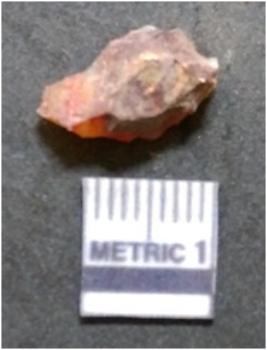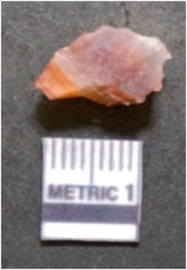 | Description / विवरण | It is carnelian flake red in color, with sharp flakes edges and a small bulb of percussion owing to knapping activity. The piece has sharp flaked edges and a crypto-crystalline matrix. |