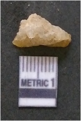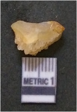 | Description / विवरण | The quartz flake has sharp flaked edges and pointed ends as a result of flaking. The piece is semi-transparent in nature with irregular fracture pattern. The piece is roughly triangular in shape and has a prominent bulb of percussion. |